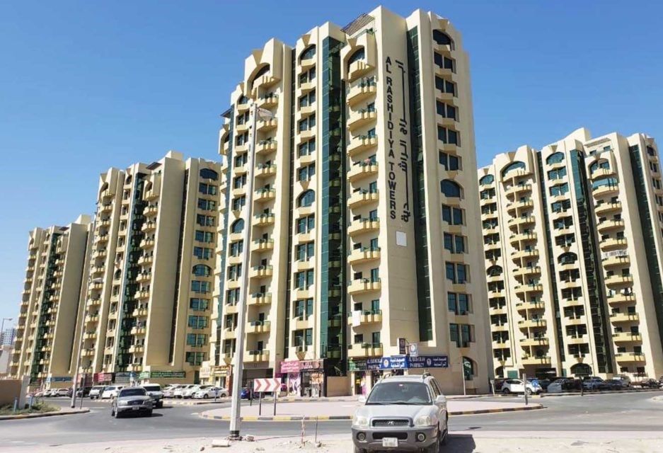 These residential structures are about a 5-minute drive from Rashidiya Towers in Ajman.