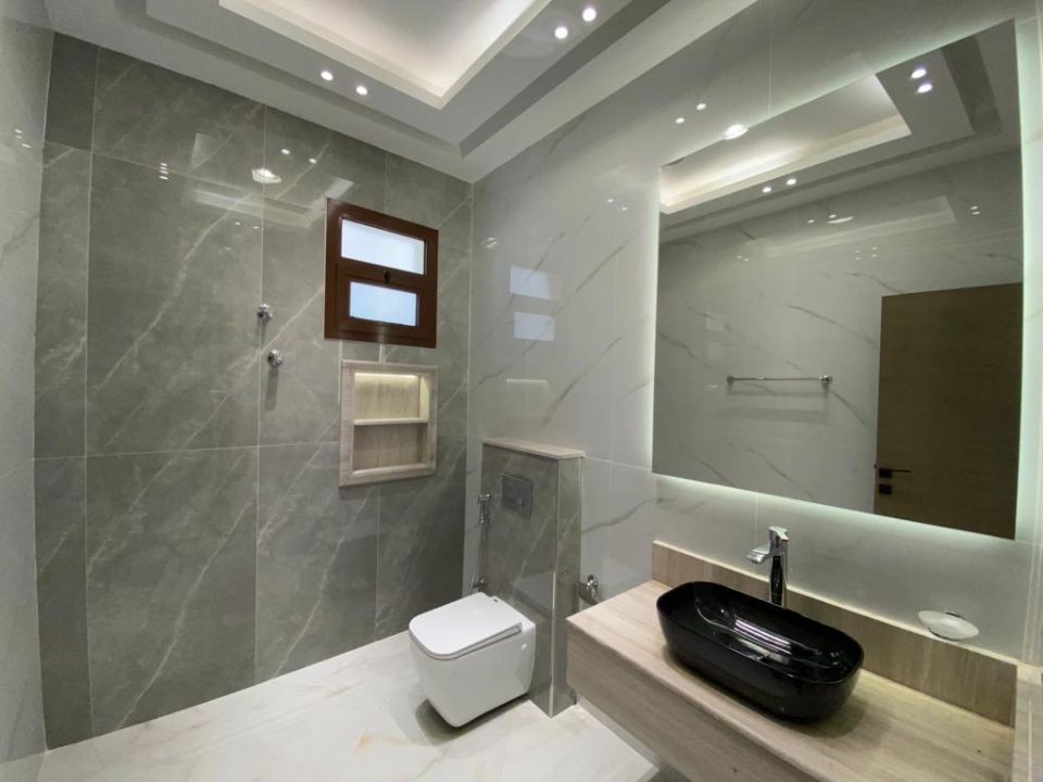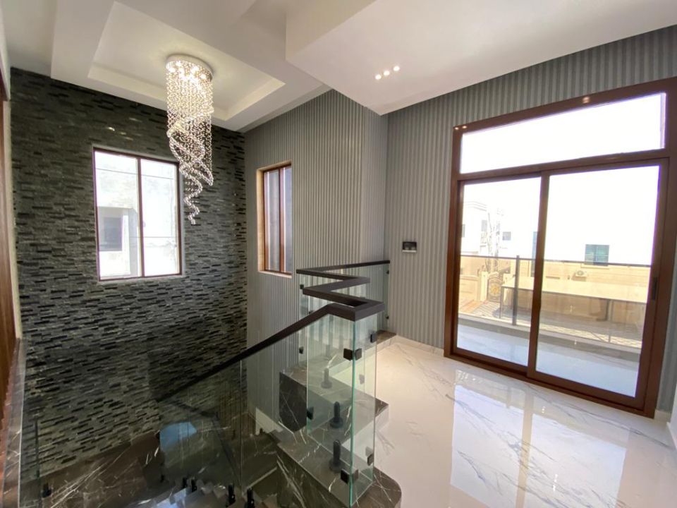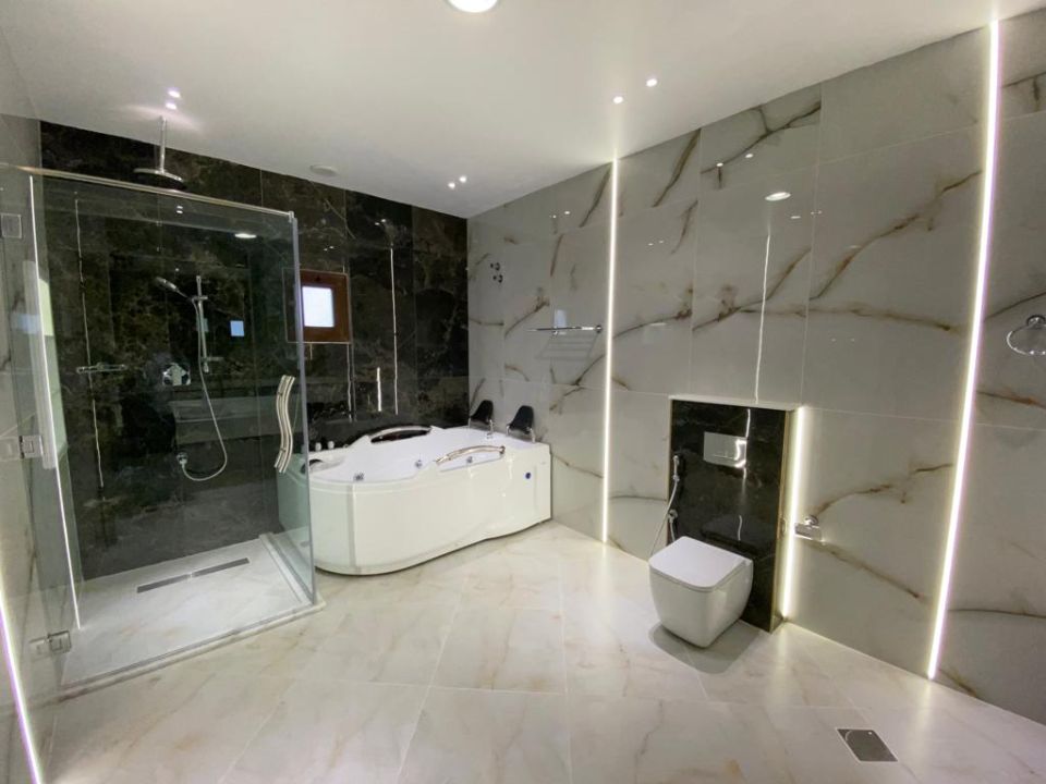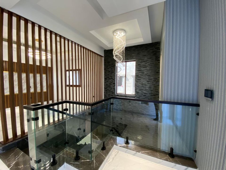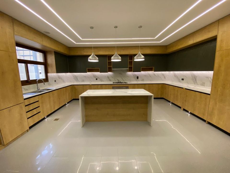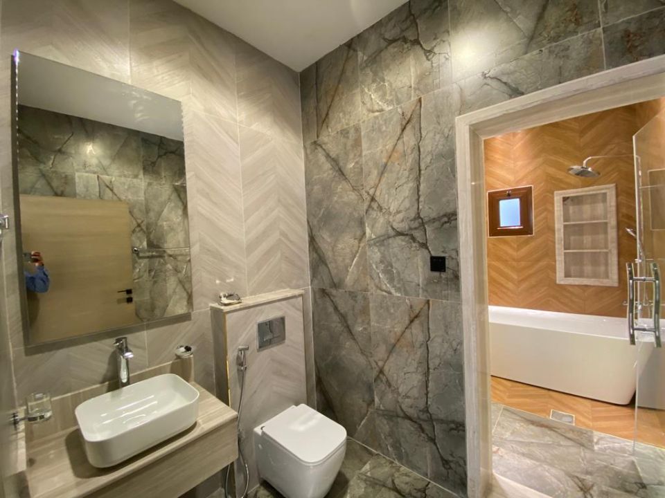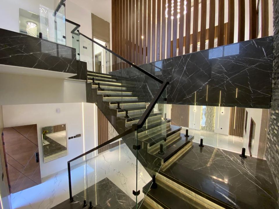The villa is spread over two floors, with one guest bedroom, kitchen, dining room, TV lounge, maid's room, and storeroom on the ground floor. The remaining four bedrooms, each with built-in wardrobes and a dry pantry, are on the first floor. The villa has a super lux finish with excellent decorations, making it a unique and stylish property. The villa features a range of amenities designed to provide residents with a comfortable and convenient lifestyle, such as: