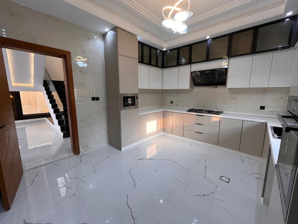 The kitchen is contemporary as well, having very sleek cabinetry and high-end fittings.