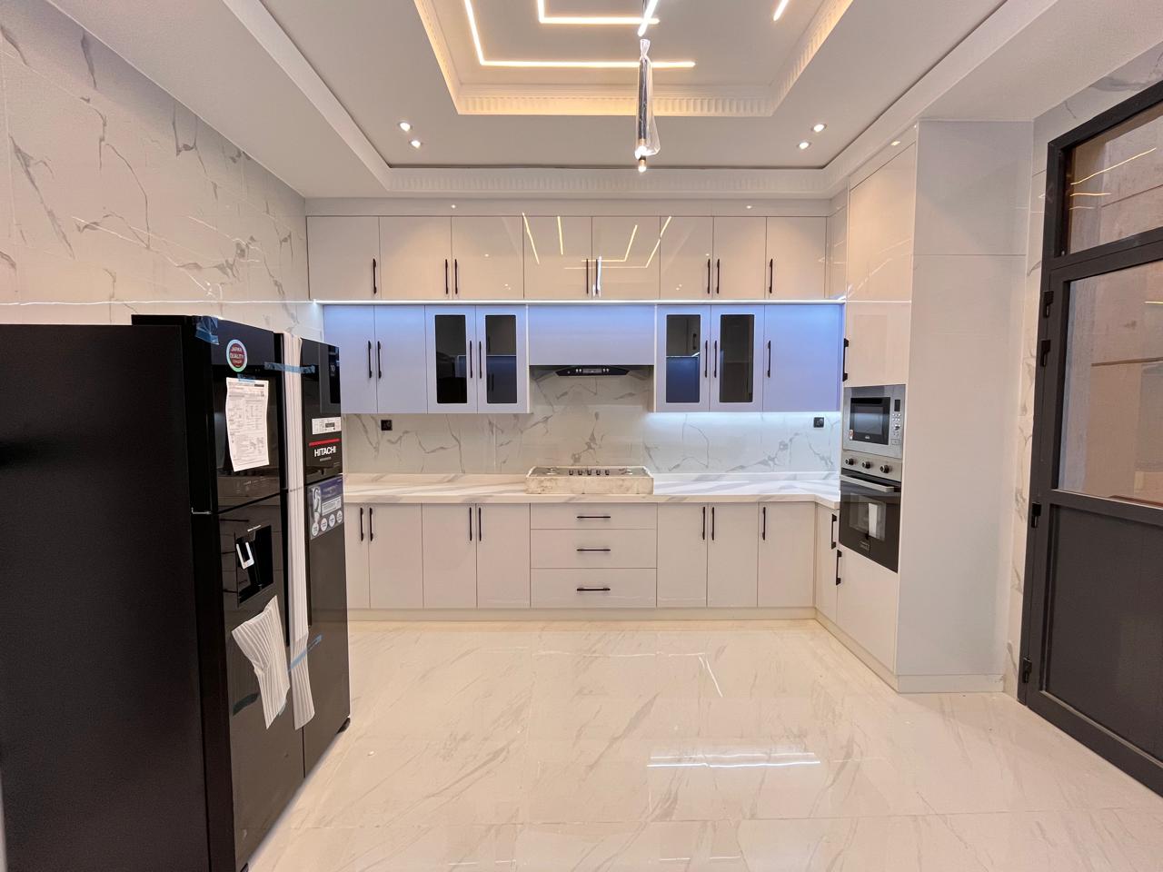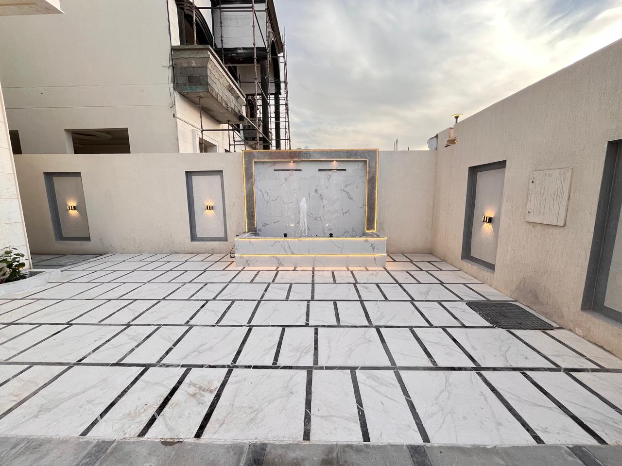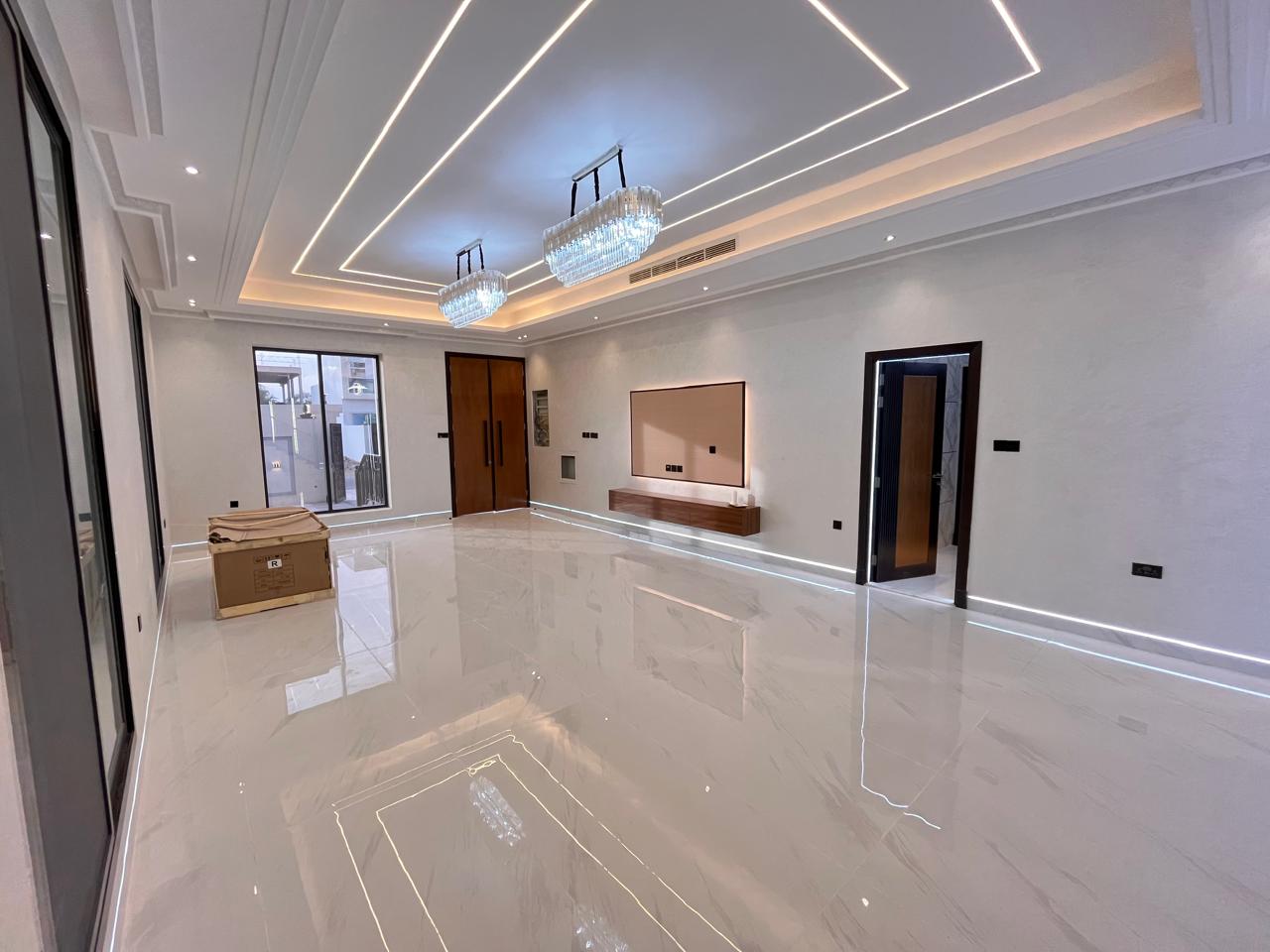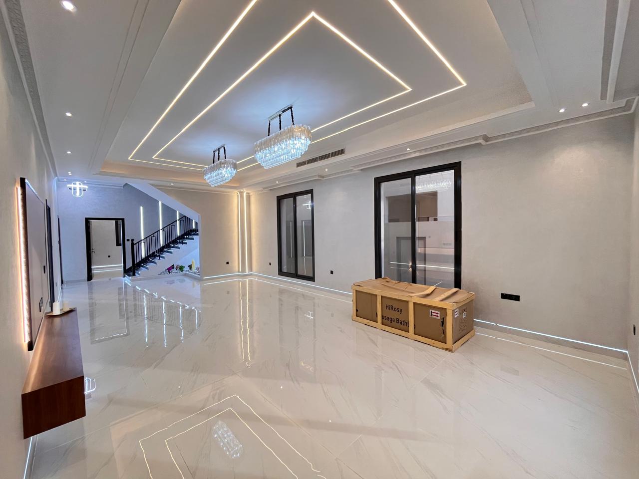 The villa features a big hall and a separate big majlis, both suitable for family use and guest hosting. It includes a big kitchen, maid's room, and 7 bathrooms, making it suitable for large households that require space and privacy.
