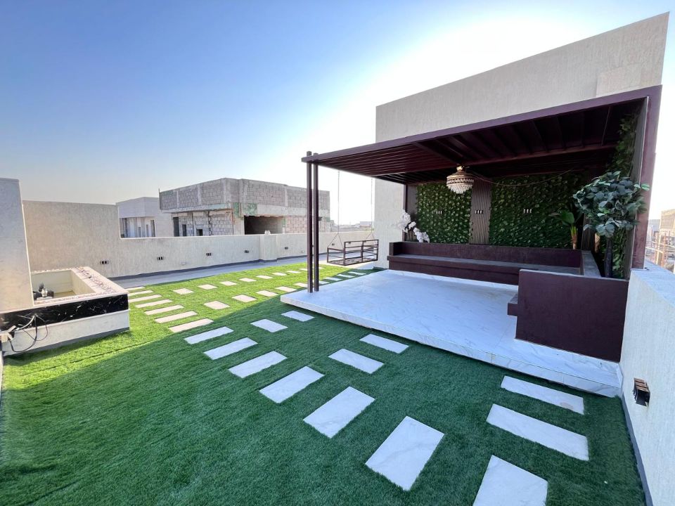 The chef's kitchen features high-end appliances and generous counter space. Other unique features include a wine cellar, a home gym, and a cinema room. On the rooftop is a beautifully designed garden, and several seating areas for al fresco dining.