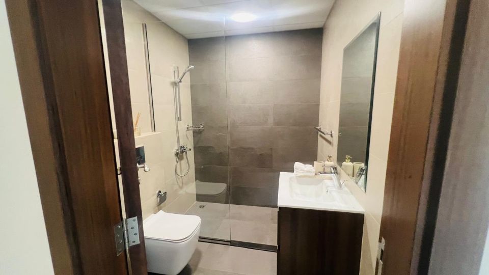 Inside the apartment, the bathroom provides a spa-like experience with its modern fixtures and finishes. A well-planned shower and vanity add to the overall aesthetic while offering comfort and style. After a hard day, this small area becomes a haven for rest.