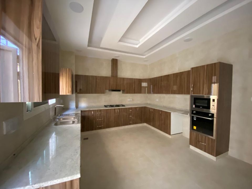 The villa is spread over two floors, with one bedroom, kitchen, dining room, TV lounge, maid's room, and storeroom on the ground floor. The remaining four bedrooms, each with built-in wardrobes and a dry pantry, are on the first floor. The villa has a super lux finish with excellent decorations, making it a unique and stylish property. The