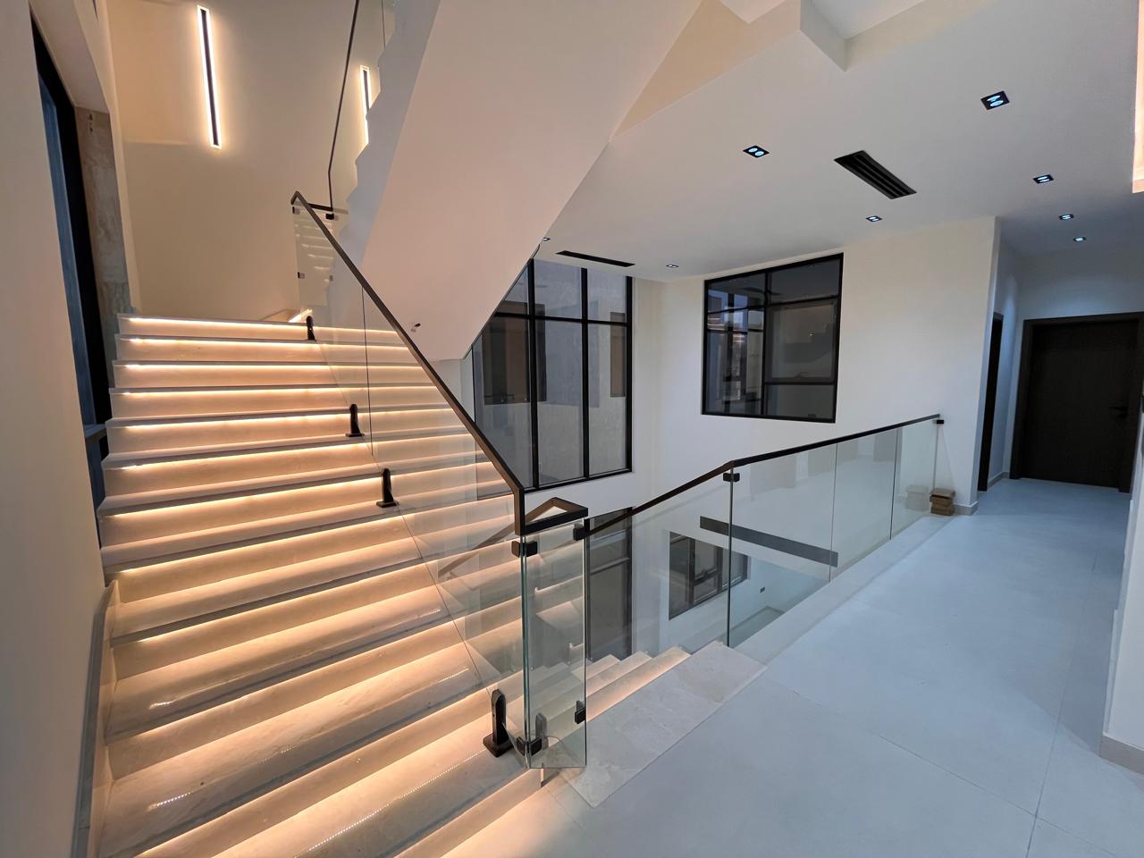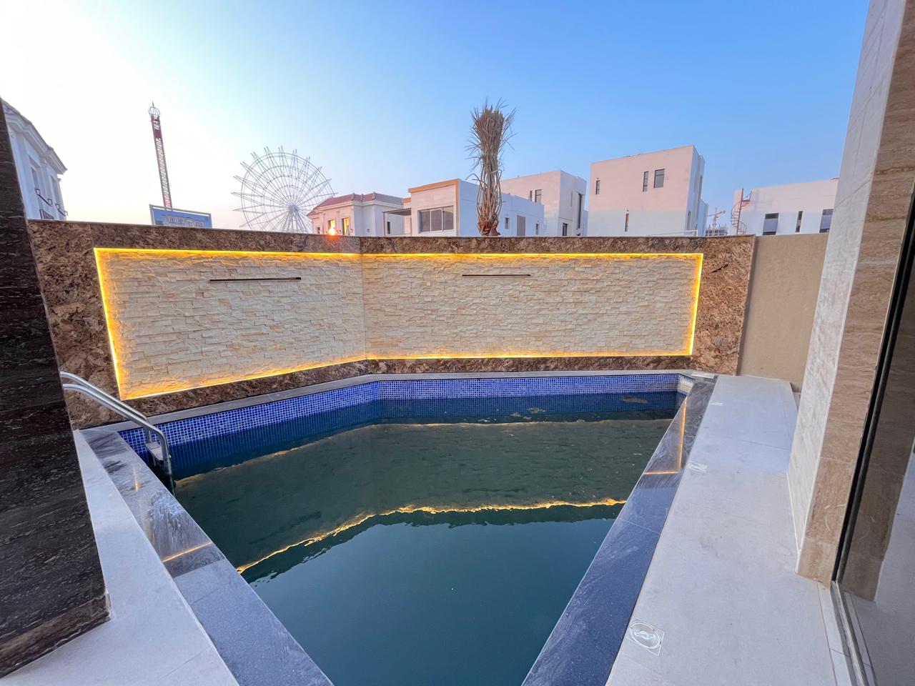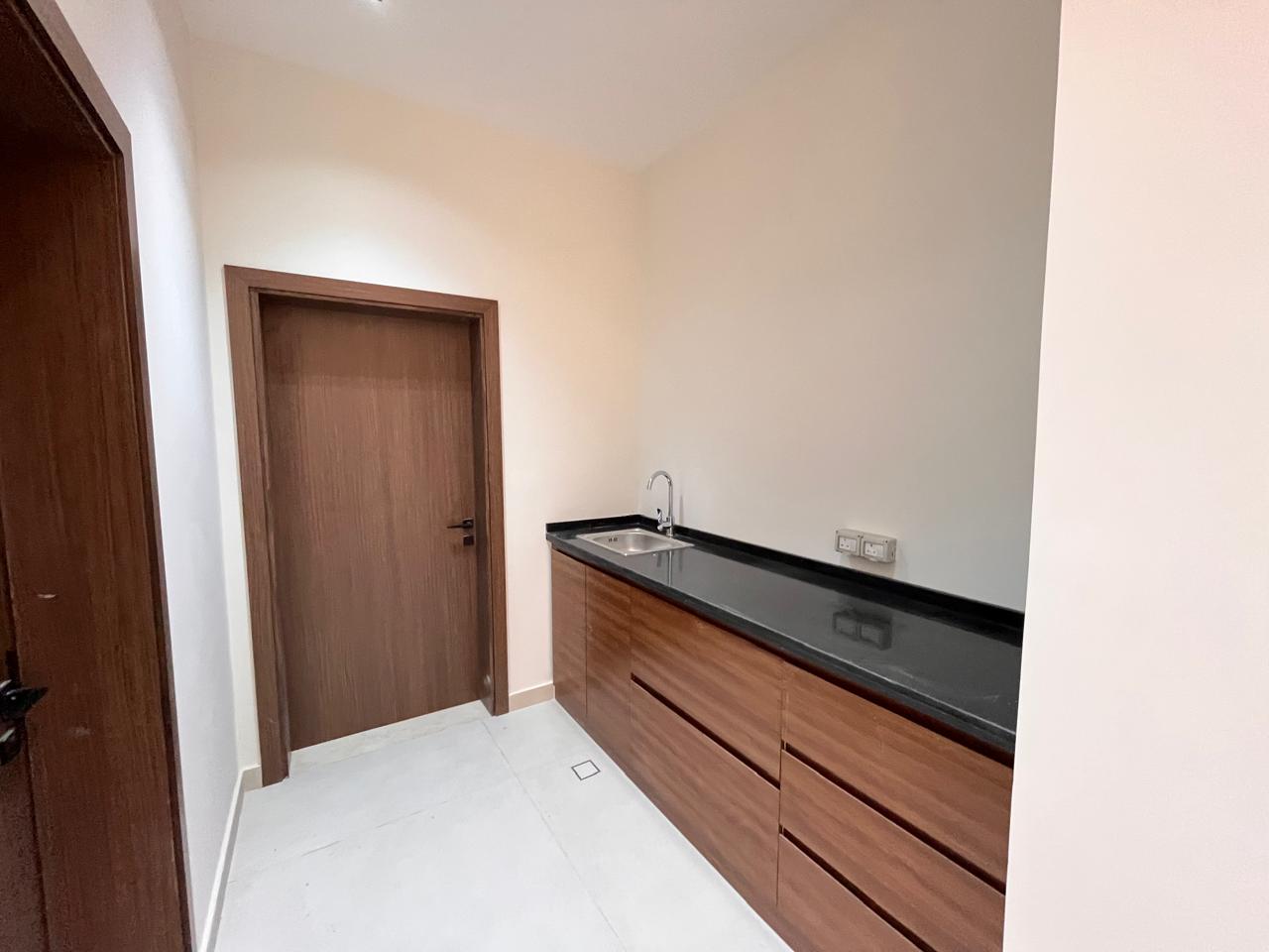 This villa has five sizeable bedrooms with en-suite shower rooms, a large living and dining room, a modern kitchen with premium fittings, and a guest majlis. The other features include a private parking space, a landscaped garden, a spacious terrace, and high-quality finishes throughout the house.