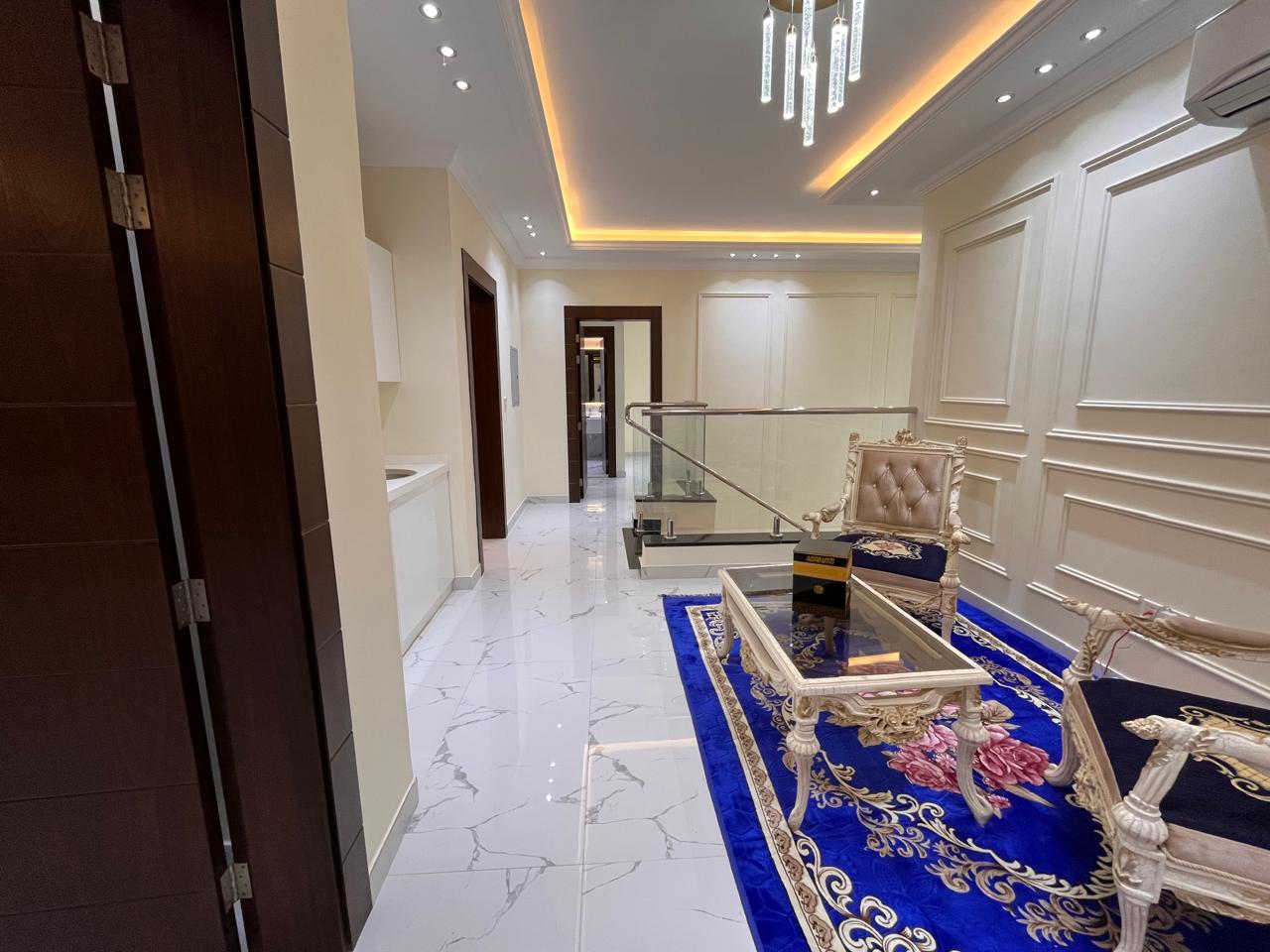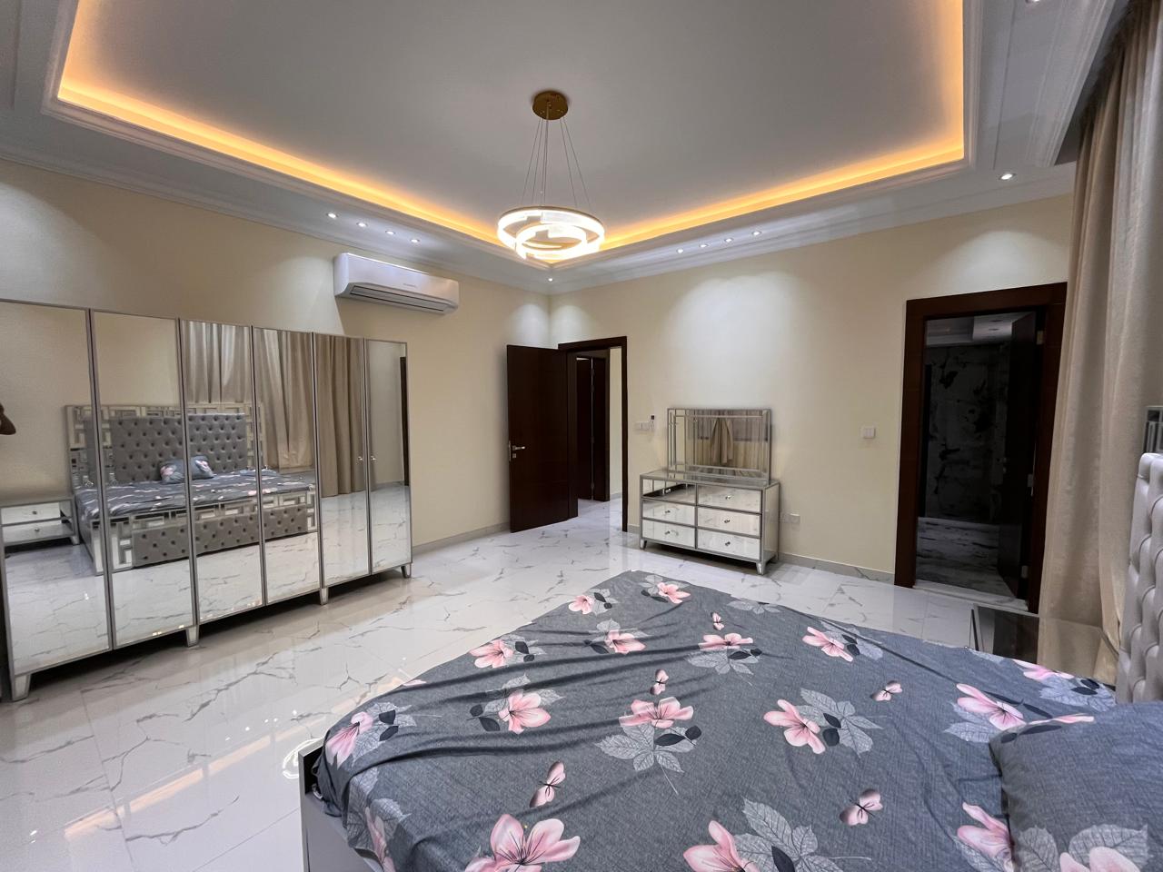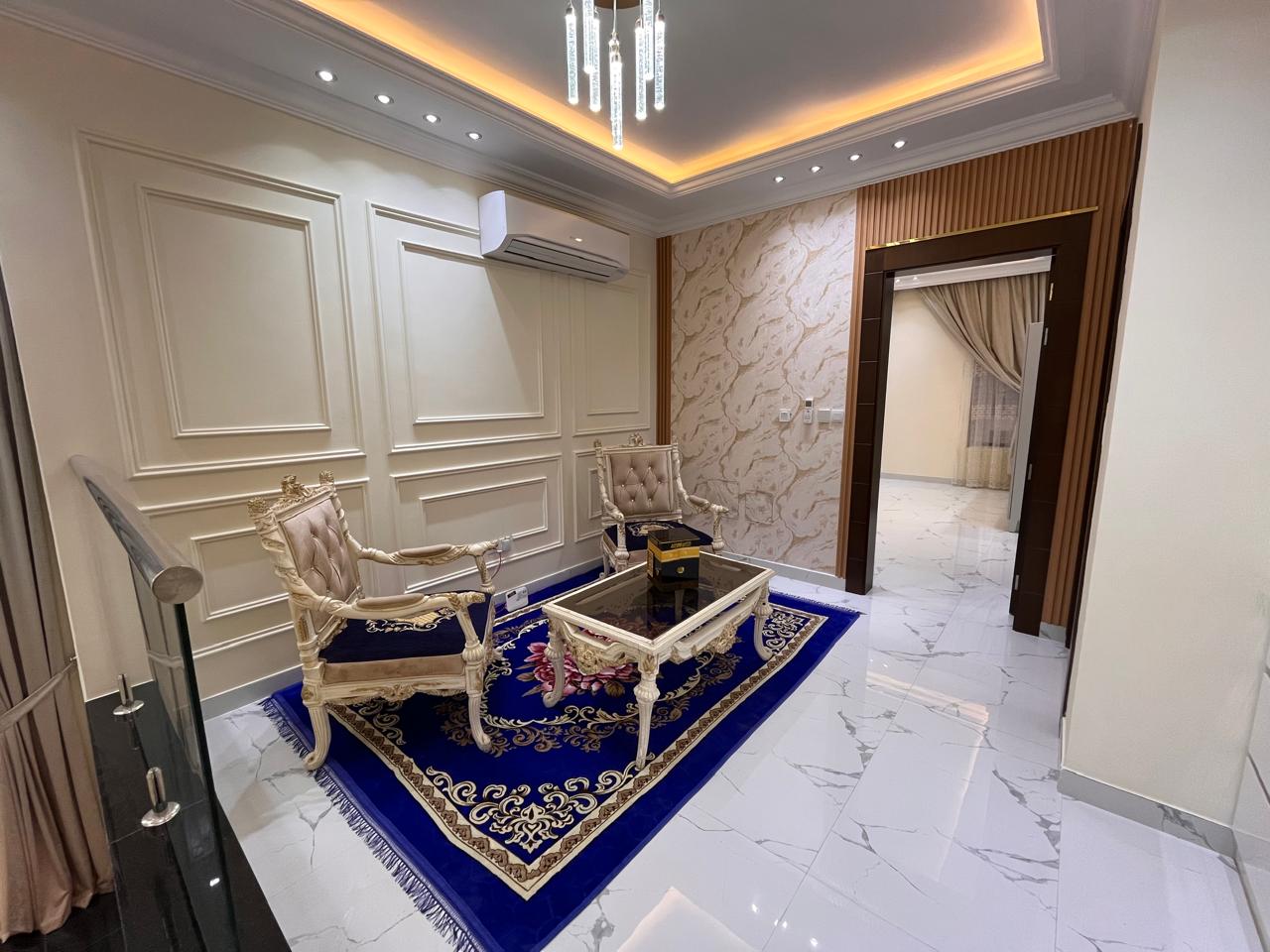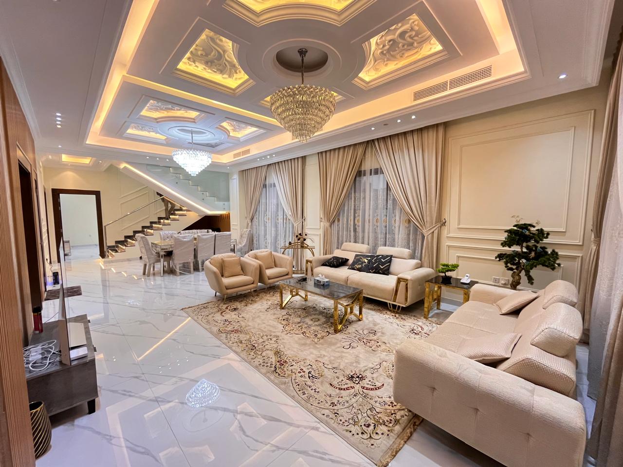 The villa features a large central air-conditioned hall and a separate majlis, both designed for family living and guest hosting. It includes a big kitchen, maid's room, multiple bathrooms, and two-storey layouts, making it suitable for large households.
