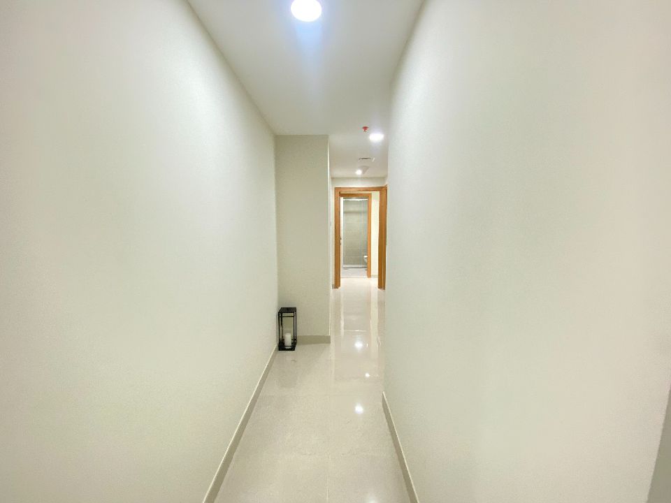 The apartment has three bedrooms, three bathrooms, a living room, and a modern kitchen, including the finest.